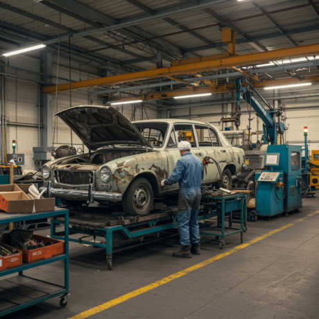 Fachgerechte Autoverschrottung in SalzgitterFahrzeug wird umweltgerecht und professionell in Salzgitter verschrottet und recycelt. Darstellung eines modernen Fahrzeugverwertungsbetriebs in Salzgitter mit Fokus auf Nachhaltigkeit